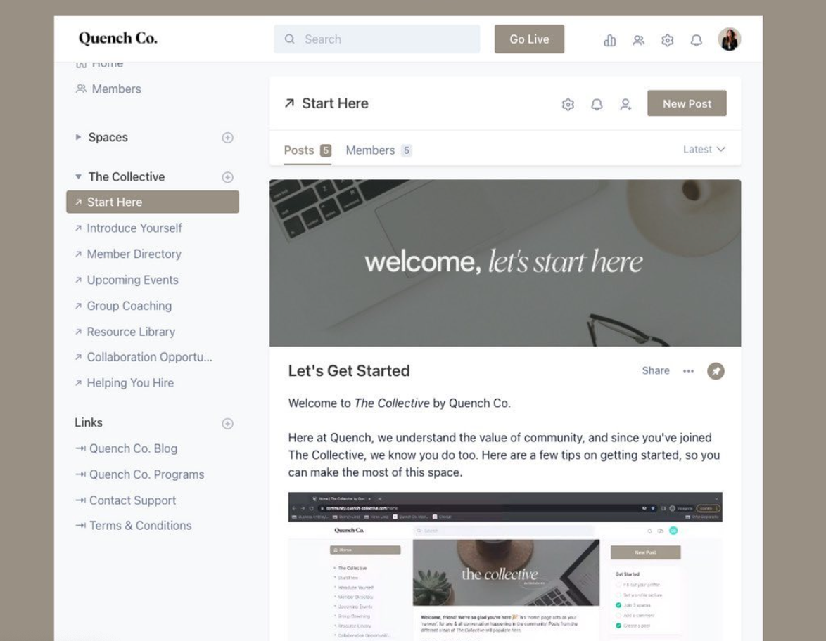 You can get a pretty modern community site set up quickly with Circle, and customize your brand colors and domain. If you have more resources to invest, you can really customize the look and feel of your Circle community by hiring a developer. We love the look of the Quench Collective's community above!