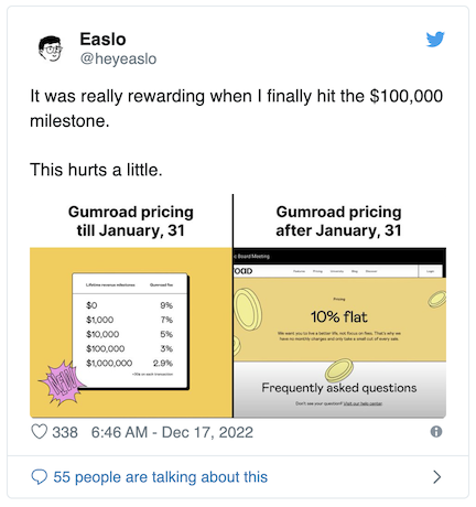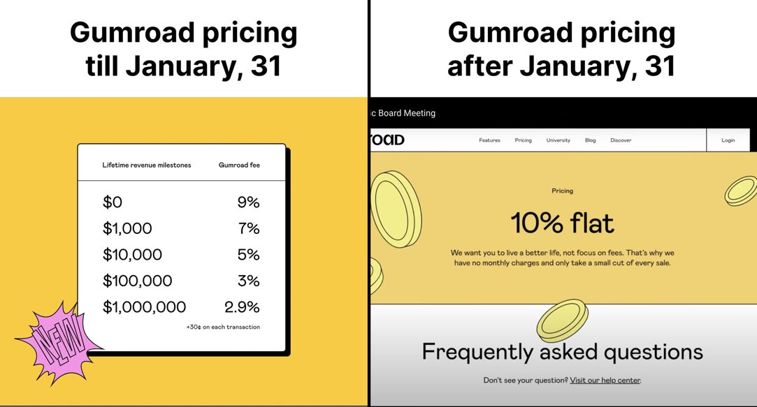 Yes, on December 17th Gumroad announced it’s raising it’s transaction fees to 10% for all creators. OUCH.