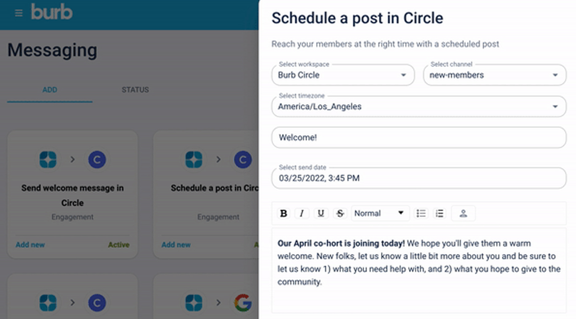 Do you know what posts you want to share with your Circle community in advance and want to schedule them? Burb allows you to schedule posts and messages, without having to wrestle with Zapier or Make (Integromat)! We'll show you how to do this easily. First, sign up for your free Burb account and...